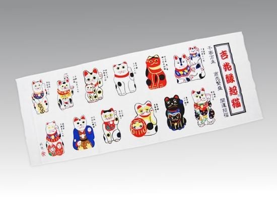 「吉兆縁起猫」の招き猫がおめでたいお年賀手ぬぐいです。